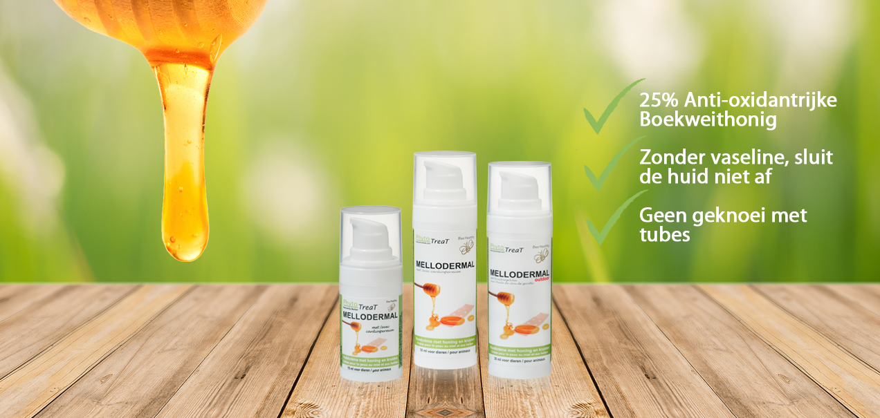 Mellodermal bevat 25% antioxidantrijke Noord-Amerikaanse Boekweithoning en ondersteunende plantenextracten waaronder Pioenroos, Kruidnagel, Rozemarijn en Cardiospermum die de huid snel tot rust brengen. Om het likken van dieren aan de behandelde huid te voorkomen, is er tevens Gentiaanwortel oftewel Bitterkruid toegevoegd.