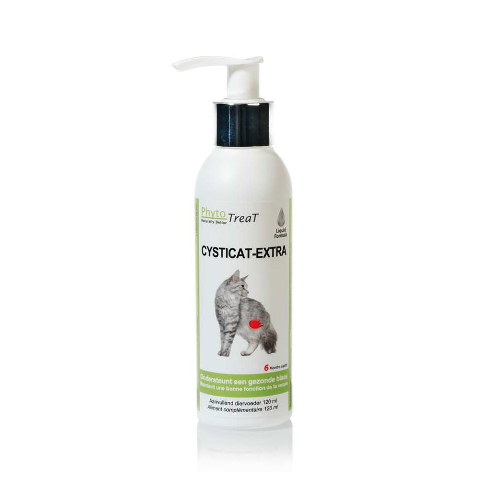 CystiCat-Extra Liquid is een smakelijk voedingssupplement in vloeibare vorm voor de kat. Het bevat N-acetyl-D-glucosamine, dat de blaaswand beschermt en daarmee het behoud van een gezonde blaasfunctie ondersteunt. Tevens bevat Cysticat de natuurlijke stof L-tryptofaan hetgeen een precursor is van serotonine, een neurotransmitter die bekend staat om de positieve invloed op de gemoedstoestand. Hibiscus helpt urinewegen schoon te houden en is effectief als anti-oxidant. Cysticat-Extra Liquid zit in een handige sprayflacon en de inhoud van de flacon is genoeg voor ongeveer vijf maanden bij een kat van 4,5 kg.