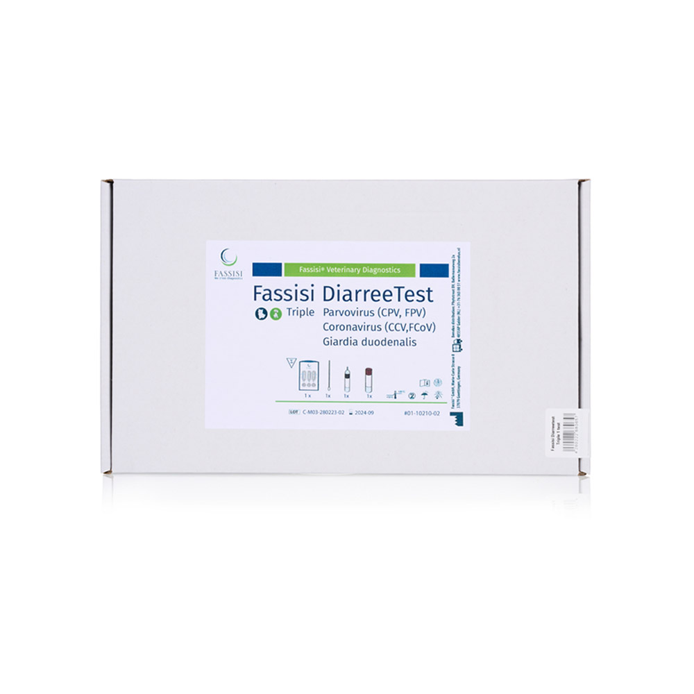 Sneltest om drie verschillende diarreepathogenen op te sporen in de ontlasting van katten en honden. Parallelle screening en differentiatie van Corona virus, Parvo virus en Giardia duodenalis (giardia lamblia en giardia intestinalis). De Fassisi Triple Test is vooral handig voor het opsporen van gemengde infecties of als het onduidelijk is welke oorzaak tot diarreeverschijnselen lijdt,