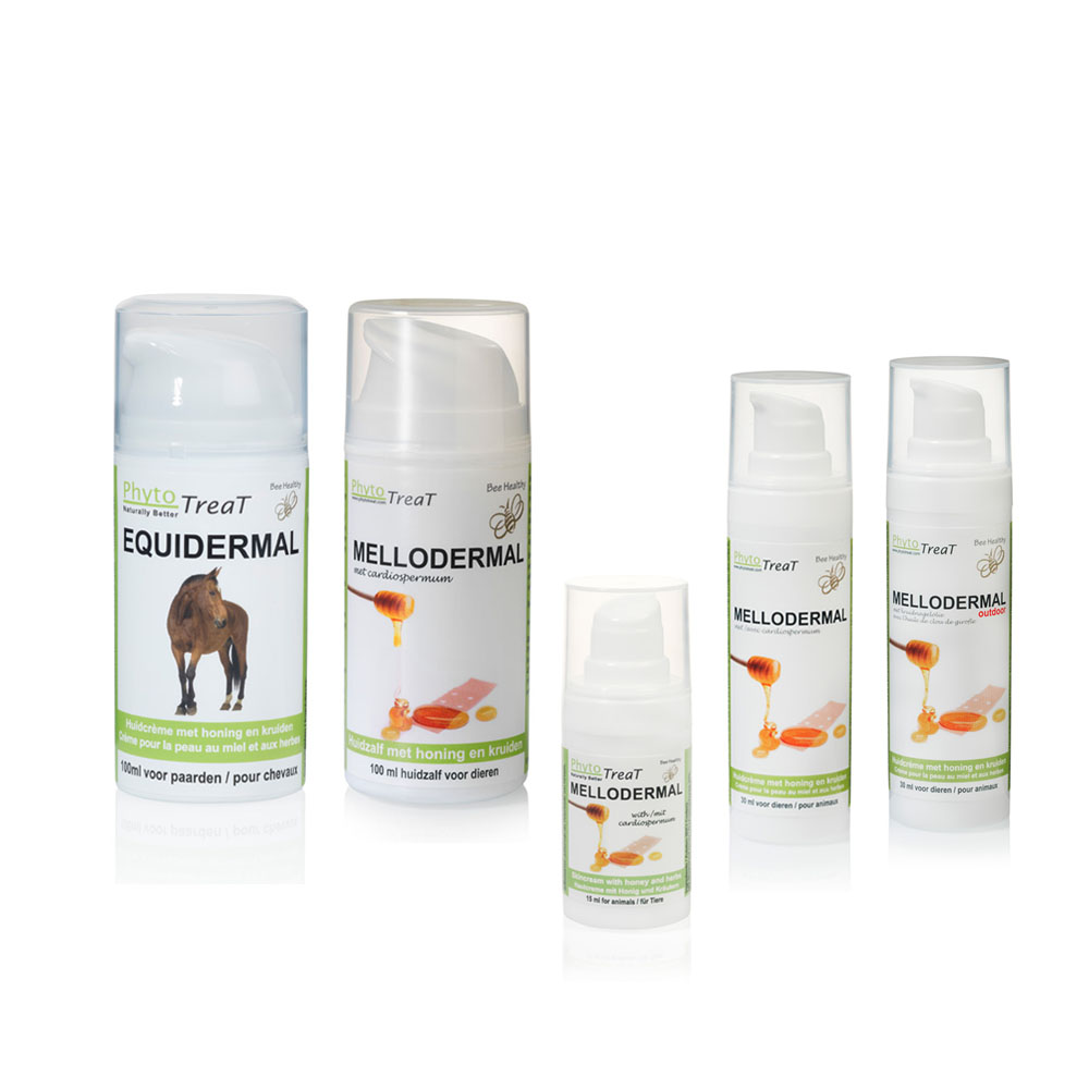 Mellodermal is een huidcrème op basis van honing en kruiden. Mellodermal bevat 25% Noord-Amerikaanse boekweithoning die rijk is aan antioxidanten en ondersteunt het natuurlijke herstel van de ruwe en schrale huid van uw (huis)dier. De Outdoor variant bevat een hogere concentratie Eugenol uit kruidnagelolie dan de Indoor variant, waardoor de honingcrème een extra kalmerende werking heeft op de gevoelige huid en tevens ongewenste elementen afgeschrikt. De antioxidantrijke honing en ondersteunende plantenextracten in Mellodermal beschermen de huid tegen uitdrogen, brengen de huid tot rust en laten de overlast snel afnemen. Het bevat tevens een bitterkruid dat voorkomt dat de dieren gaan likken aan de behandelde plek. Mellodermal is bovendien niet vet, plakt niet en is gemakkelijk smeerbaar. Het bevat geen vaseline en dekt zodoende de huid niet af. Tevens is de crème vrij van parabenen, geur- en kleurstoffen. Dankzij de hygiënische pompflacon laat de Mellodermal zich gemakkelijk aanbrengen en is deze zeer zuinig in het gebruik. De huidcrème wordt door dieren goed verdragen.