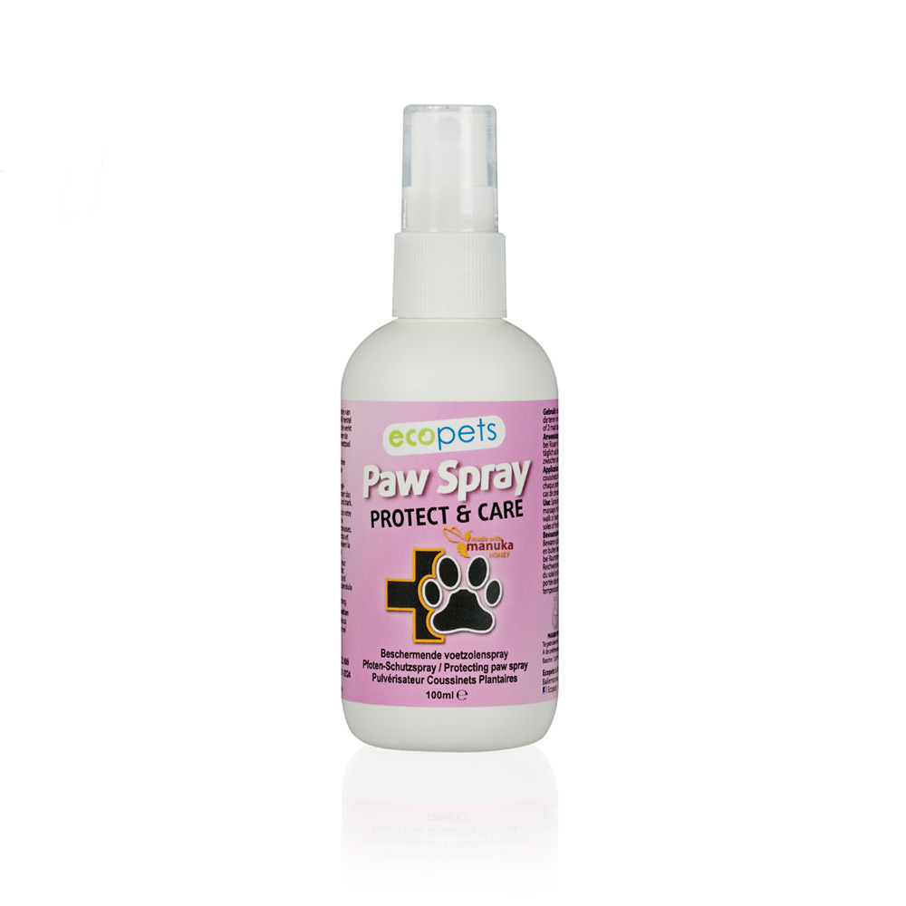 Paw Spray met Manuka honing houdt de voetzolen van uw hond en kat zacht, soepel waardoor deze gemakkelijker sneeuw, strooizout, ijs, grind en heet asfalt kunnen verdragen.Het beschermt tegen de impact van deze extreme omstandigheden en biedt zodoende een effectieve bescherming gedurende het gehele jaar. Het geeft de jonge of oudere hond meer grip op een gladde vloer. De Manuka-honing ondersteunt de natuurlijk heling van wondjes en kloofjes en werkt reinigend. De Calendula, Bamboe-extract en Tea tree olie hebben een reinigend en verzorgend effect waardoor bij regelmatig gebruik schrale voetkussentjes weer soepel en zacht worden en zo minder kwetsbaar zijn.
